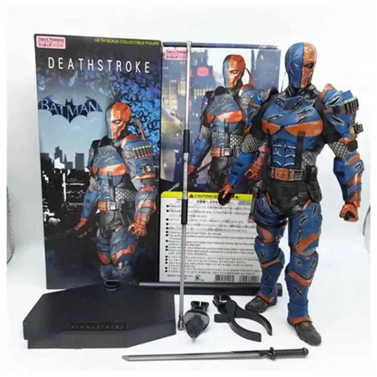 اقلام همراه: شامل یک عدد اکشن فیگور دث استروک یک عدد شمشیر سلاح دث استروک و یک نگه دارنده